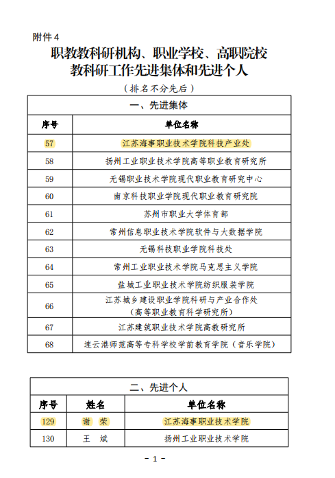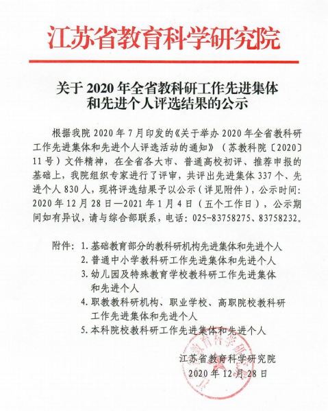 日前,在江苏省教育科学研究院组织的2020年全省教科研先进集体和先进个人评选活动中,我校科技产业处被评为“江苏省教科研工作先进集体”,谢荣教授荣获“教科研先进个人”。该奖项每两年评选一次,我校能获此殊荣,体现了省教科研主管单位对我校教科研工作持续高质量发展的充分肯定。