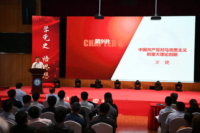 校长万健讲授《中国共产党对马克思主义的重大理论创新》,深刻阐述了马克思主义矛盾论的发展,并以党对过去和当今国内主要矛盾的判断的不断变化来分析党对理论创新。从总结历史经验中把握历史规律,在实践中不断进行理论创新,汲取开拓前进的强大动力,是党永葆活力的密码。他强调要将悟思想、办实事、开新局贯穿办学治校的始终,在学思践悟、扎根铸魂、顶天立地、求是创新中走向卓越。