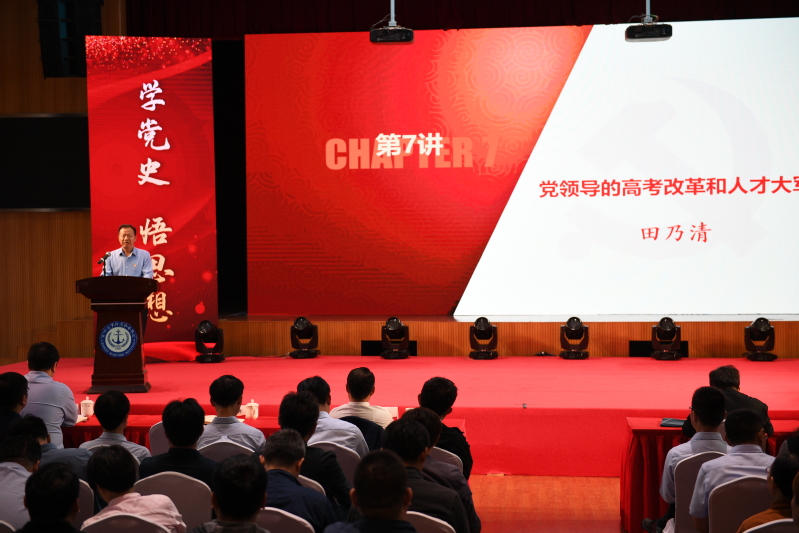 副校长田乃清讲授《党领导的高考改革与人才大军》,列举了我国从古至今的人才选拔的发展历史,着重讲述了党领导的教育评价改革和我校人才选拔和培养上的成就。