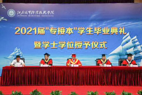 6月11日下午,江苏海事职业技术学院2021届“专接本”毕业典礼暨学士学位授予仪式在图书馆报告厅举行。学校党委书记刘红明、南京财经大学继续教育学院院长秦嘉杭、南京师范大学公共管理学院副院长倪咸林、江南大学继续教育学院副院长李剑出席仪式,各二级学院分管学生工作负责人以及2021届“专接本”应届毕业生和在校生代表参加仪式。典礼由学校继续教育学院院长王松明主持。