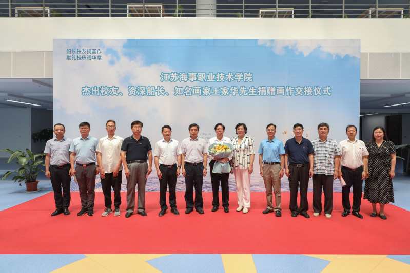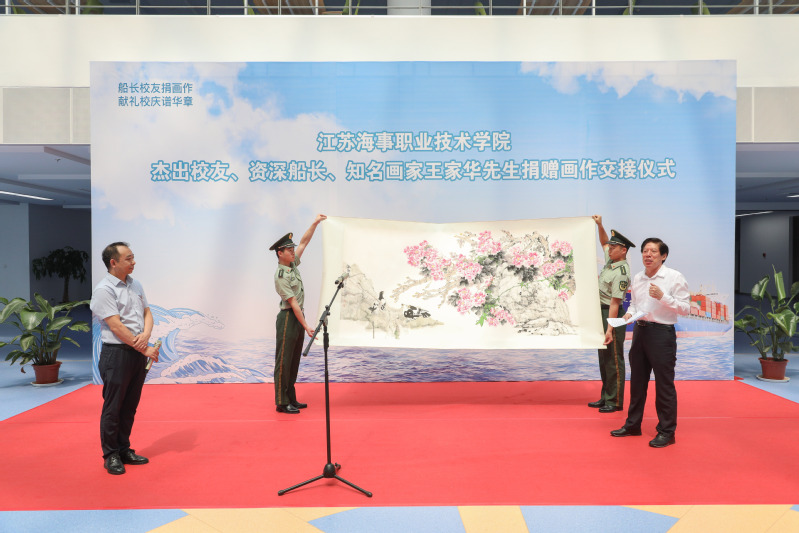 在第17个中国航海日,江苏海院70周年校庆倒计时110天之际,我校杰出校友、资深船长、知名画家王家华先生向学校捐赠他多年创作珍品70幅牡丹书画作品,以实际行动为母校70华诞献礼。7月11日上午10:00,船长校友捐画作 献礼校庆谱华章杰出校友、资深船长、知名画家王家华先生捐赠画作仪式在图书馆二楼隆重举行,王家华校友及夫人,上海第三开关制造有限公司董事长蔡永光,江海集团总船长孙天祥,学校党委书记刘红明,校长万健,副校长田乃清,党委委员、宣传部长刘桂香及100余名我校师生、书画爱好者参加了捐赠仪式。仪式由田乃清主持。