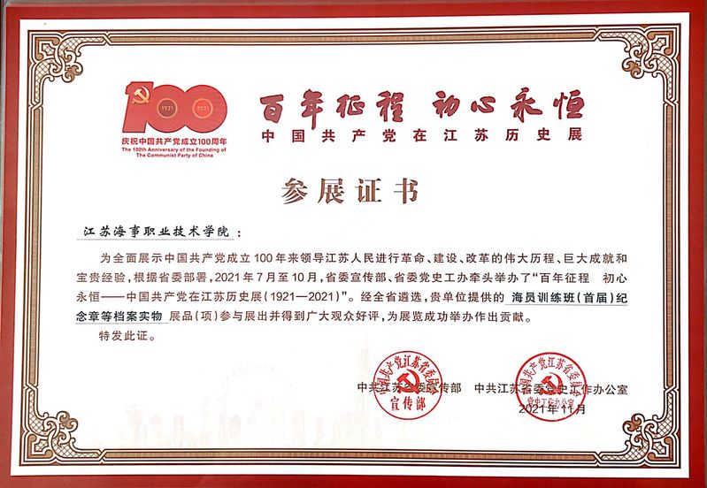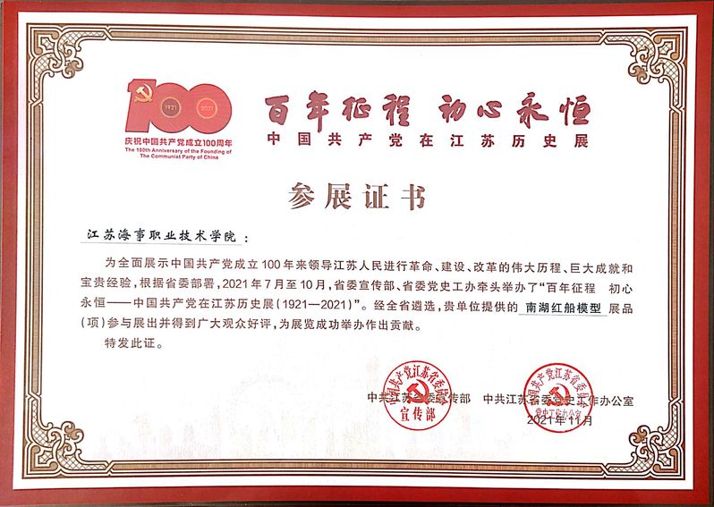 2021年7月至10月,“百年征程 初心永恒——中国共产党在江苏历史展”在南京国际博览中心陈展。作为江苏省受邀参展的高校,我校师生共同创作的“南湖红船”及我校“海员训练班(首期)纪念章”等档案实物在展区展出,成为中国共产党在江苏浴血奋战、艰苦创业、改革创新的生动见证。