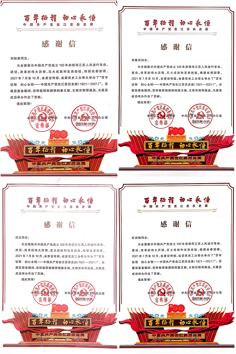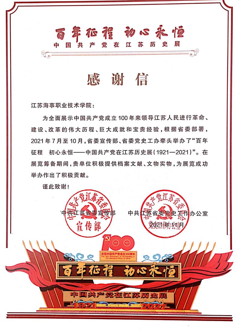 近日,中共江苏省委宣传部、中共江苏省委党史工作办公室向我校发来感谢信,感谢学校为“百年征程 初心永恒”中国共产党在江苏历史展(1921-2021)的成功举办给与的大力支持,并为学校展品颁发参展证书。