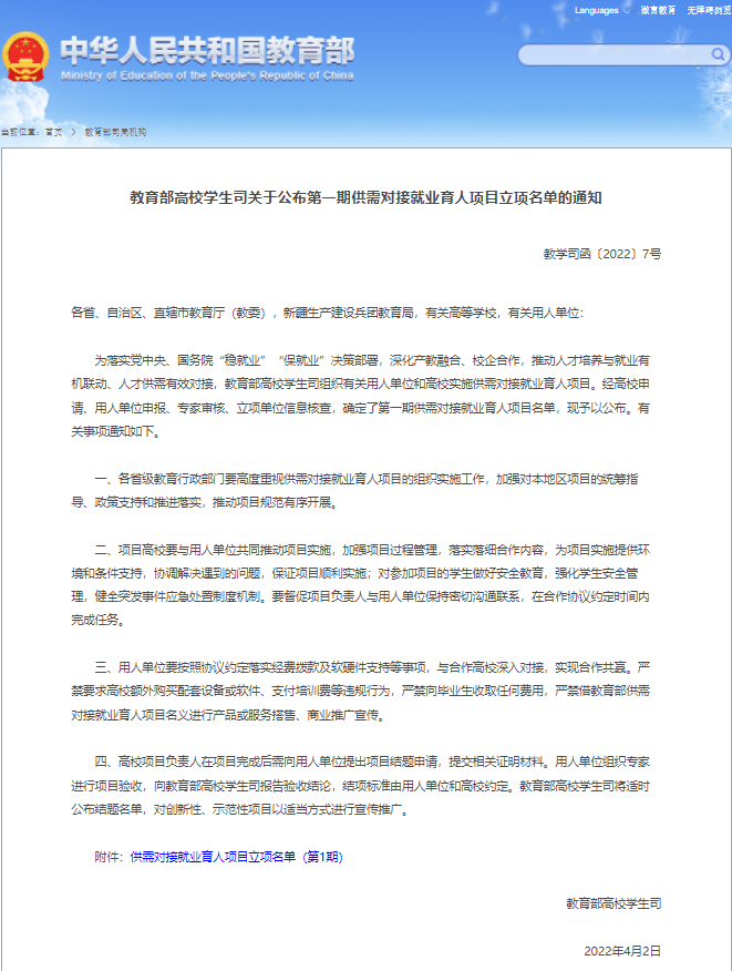 教育部高校学生司供需对接就业育人项目是为落实党中央、国务院“稳就业”“保就业”决策部署,深化产教融合、校企合作,推动人才培养与就业有机联动、人才供需有效对接。经高校申请、用人单位申报、专家审核、立项单位信息核查,确定了第一期供需对接就业育人项目名单。