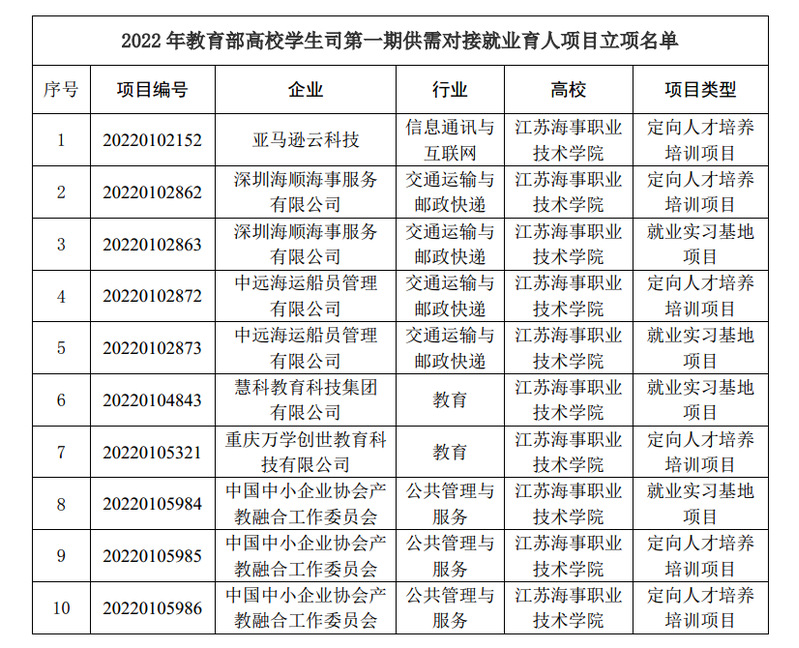 近日,教育部高校学生司印发《关于公布第一期供需对接就业育人项目立项名单的通知》(教学司函〔2022〕7号),公布第一期供需对接就业育人项目名单,我校共有10个项目获批立项。