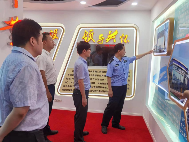 孔爱良所长热情地接待了我校党员教工们一行,带领大家来到趸船上的警营文化室,详细介绍了长航公安南京分局江宁派出所的组织架构、队伍建设、以及打击犯罪、治安防控、消防监管、联勤联动等工作职责和获得的荣誉,并向大家普及了长江生态保护的相关知识,使党员教工对长航公安的工作性质和当前沿江整体环境修复等情况有了直观的认识。