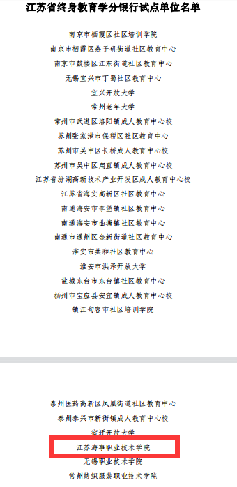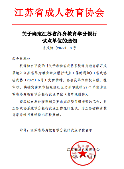 7月1日,江苏省成人教育协会发布《关于确定江苏省终身教育学分银行试点单位的通知》(省成协〔2022〕18号),我校成功入选江苏省终身教育学分银行试点单位。