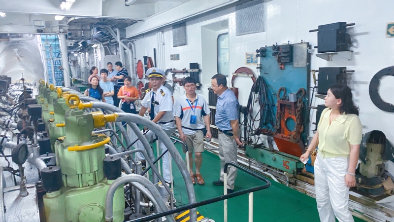 顶着烈日,专家们来到教学实习船“育新”轮的甲板和舱盖,欣赏江面上的秀丽风光,领略江中巨轮踏浪前行的磅礴气势。随后,在工作人员的引导下专家们分组参观了船员生活区、驾驶台、机舱、科普展馆等地。专家们和工作人员就船舶设备和仪器的使用、维护与管理,学生实训的组织安排,校企合作开发实习船教学项目及实习船功能拓展等多方面进行了深入的沟通与交流。