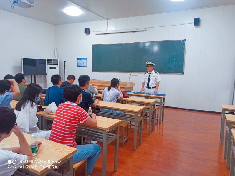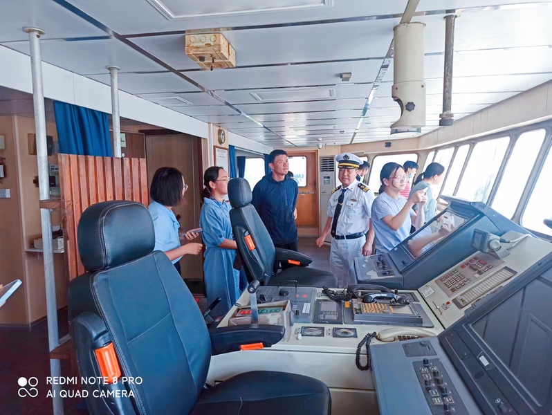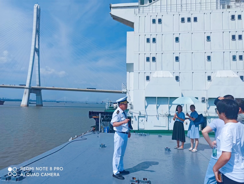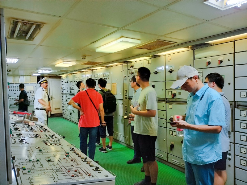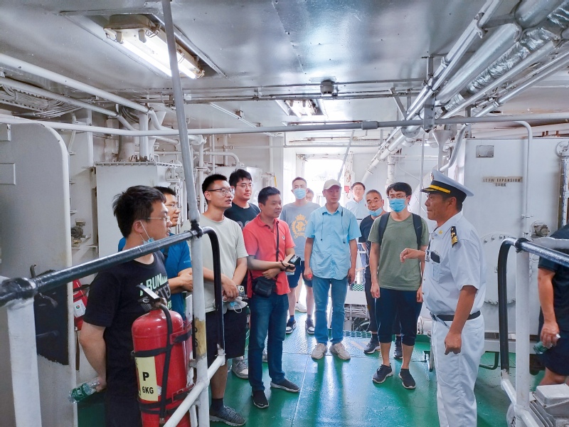 实训基地全体工作人员身着制服热情地迎接培训班教师们的到来。教师们刚一踏上实训基地码头,就被眼前的景象深深吸引纷纷驻足拍照。王书扬船长简要介绍实训基地建设历程和教学实习船“育新”轮基本情况,引导教师们来到教学实习船“育新”轮的甲板和舱盖上,欣赏长江“百舸争流” “千帆竞发”的壮阔美景。随后,在工作人员的陪同和讲解下教师们依次参观了船员生活区、驾驶台、机舱及江豚珍稀濒危物种宣传教育展馆。虽然酷暑难耐,但仍阻挡不了教师们学习交流的热情。期间,教师们就船舶仪器设备的功能与使用、管理与维护、学生实训安排、船舶虚拟场景开发等方面问题和实训基地工作人员进行了深入沟通与交流。
