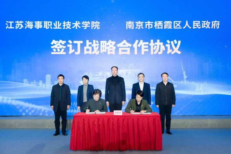 会上,陈晓琴代表学校与南京市栖霞区人民政府签订战略合作协议,标志着双方校地协同、共促发展的合作进入新阶段。南京市副市长张蕴、栖霞区区委书记孙海东、栖霞区政协主席张常军、江苏省港口集团副总经理唐文和校长温华兵共同见证签约。学校将以此次合作为纽带,深度融入栖霞港航产业生态,与各方携手并肩,在港航技术技能型人才培育、科研成果转化、产业智库建设等方面提供坚实支撑,为栖霞区域性航运物流中心建设注入强劲“海事智慧”与“人才动能”。