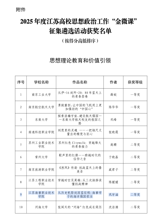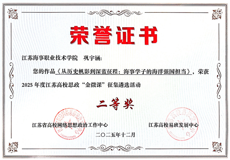 近日,由江苏省高校网络思想政治工作中心和高校易班发展中心组织开展的2025年度江苏高校思政“金微课”征集遴选活动结果公布,我校航海技术学院巩宇涵老师的作品《从历史帆影到深蓝征程:海事学子的海洋强国担当》荣获二等奖。