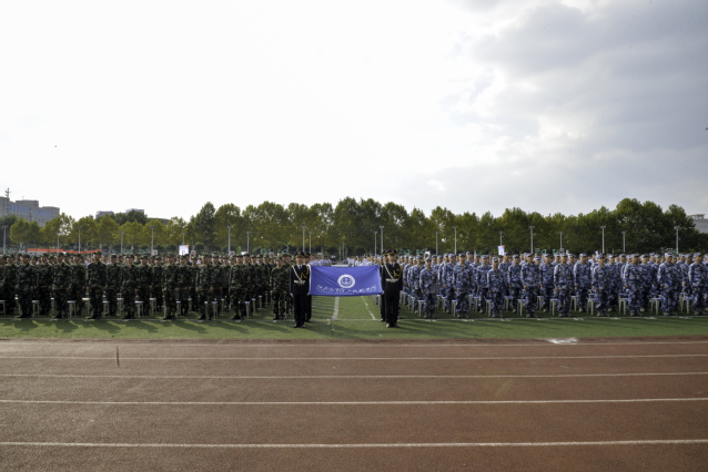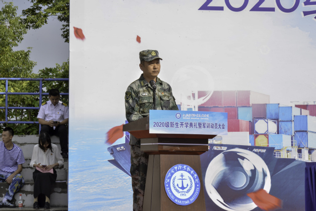 随后副校长田乃清向军训团团长袁周授军训团团旗,军训团团长袁周老师做了军训动员。