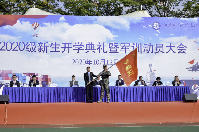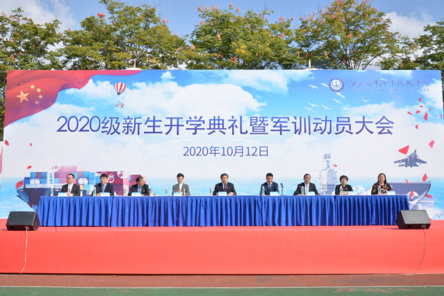 校长万健为典礼致辞,他代表学校党委行政、全校师生员工对新生的到来表示热烈的欢迎和诚挚的祝贺。讲话中,万健校长给新生们提出了三点要求:一是要学会自信,树立自信要从学会自理开始;二要学会包容,要能包容别人缺点,懂得欣赏别人,常怀感恩之心;三是要学会坚守,要在专业领域一门心思扎下去,不断精益求精,追求卓越。最后,他祝愿全体新生在海院生活愉快,学有所成。主席台领导、优秀校友代表为新生代表授予学生证。