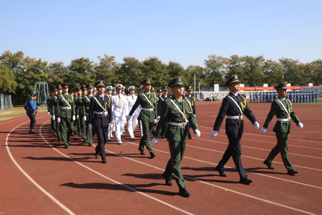在雄壮的国歌声中,大会拉开序幕。军训团团长袁周指挥分列式表演,在军训团团旗的引导下,各学院方队依次通过主席台,同学们仪容严整、精神振作、士气高昂,挺拔的军姿、有力的步伐、坚定的目光,展现了新时代海院学子的青春写意和自信傲骄,“海涵地负、德诚志远”校训声此起彼伏,士官生“听党指挥、能打胜仗、作风优良”的强军口号响彻全场,大会现场掌声、喝彩声不断。