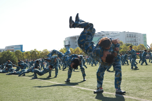 在集体节目表演环节,百名女生拉开格斗术方阵,刚柔并济、英姿飒爽,海院巾帼柔美铿锵;男生表演捕俘拳,力贯全场、气势如虹,海院男儿热血贲张。