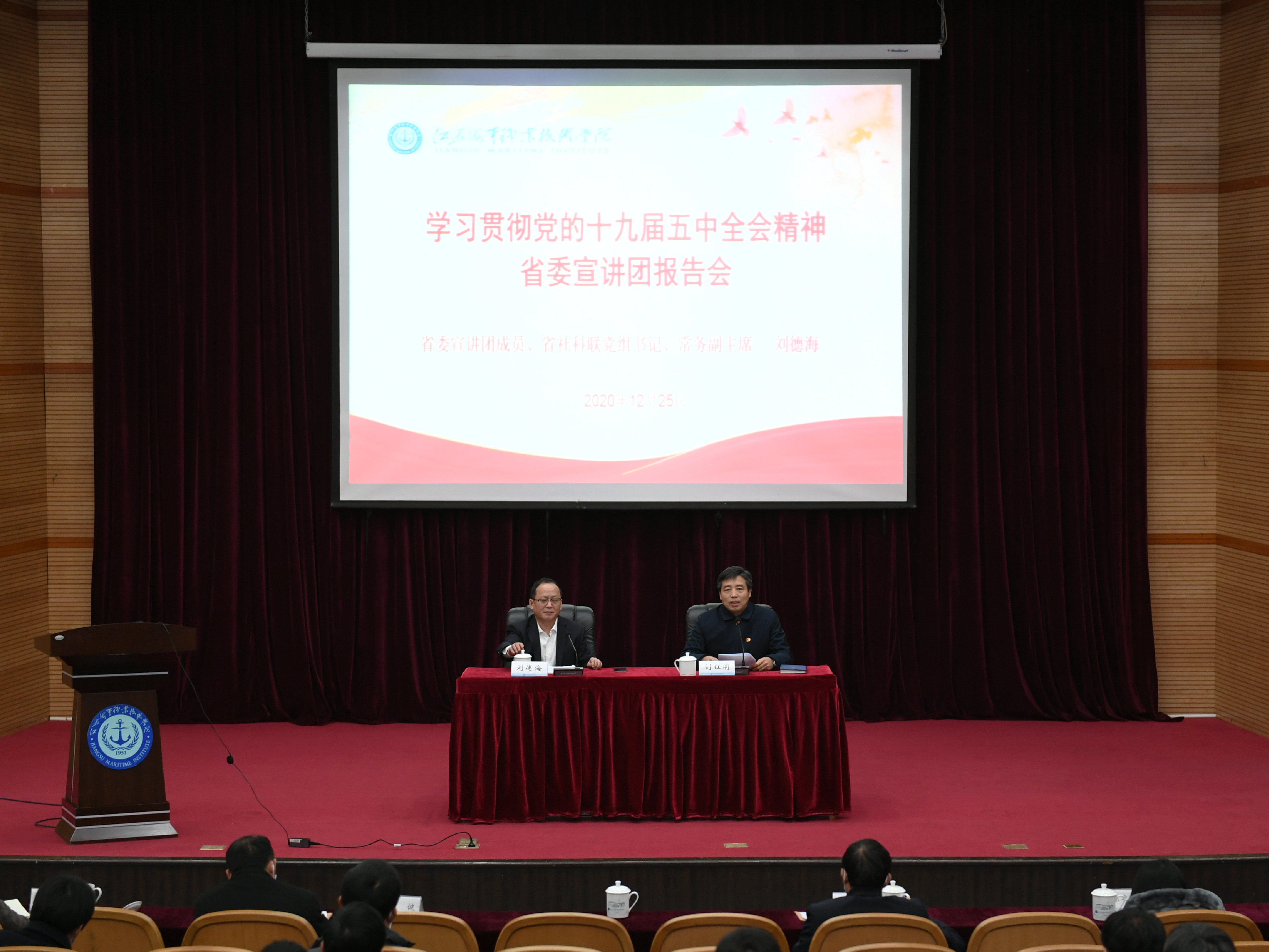 12月25日下午,学习贯彻党的十九届五中全会精神省委宣讲团报告会在我校图书馆大报告厅举行。省委宣讲团成员,省社科联党组书记、常务副主席刘德海研究员应邀作宣讲报告。我校全体校领导、中层干部、党支部书记、思政课教师和辅导员到会听讲。党委书记刘红明主持报告会。
